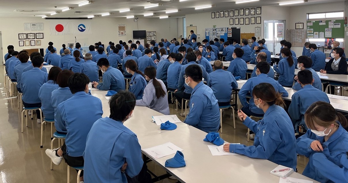 下記は全体朝礼の様子です。