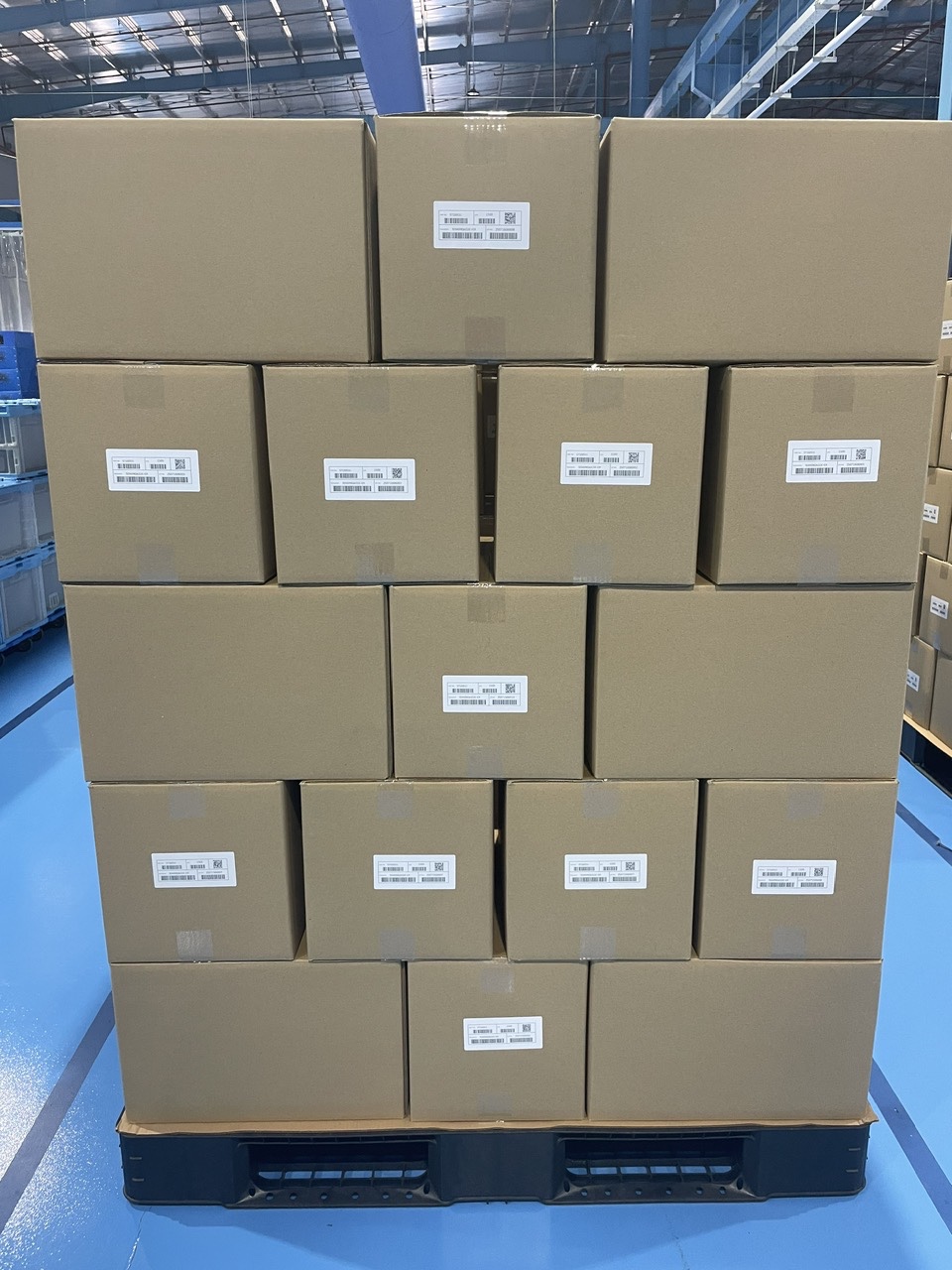 その後、ラベルを梱包箱に貼付けてパレットに積み込みます。
